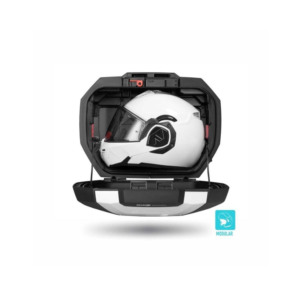 - Capacidad interna: 1 casco modular talla XL ECE 22-06 por maleta en posición expandida (según modelo y volumen de casco)
